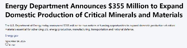 | 原文题名 | Energy Department Announces $355 Million to Expand Domestic Production of Critical Minerals and Materials |